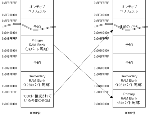 ARMはアドレスの0番地付近にリセットベクタなどを配置していますが、起動直後にはその領域には外部のROMが接続されています。しかし、REMAPという操作を行うと、Primary RAM Bankがその領域にマッピングされます。