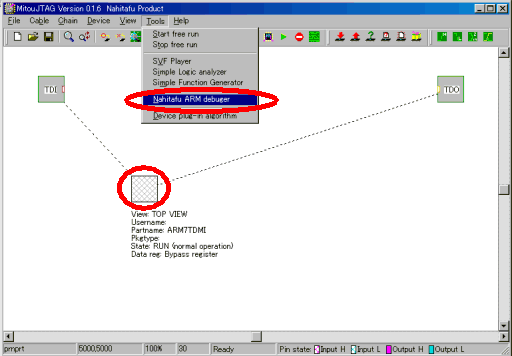左シングルクリックでデバイスを選択し、メインメニューから「Tools→Nahitafu JTAG ARM debuger」で起動してください。