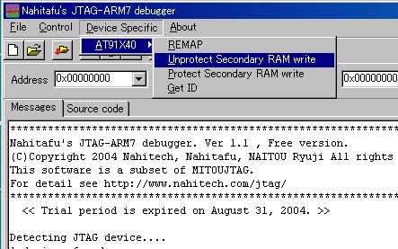 メモリの書込み禁止を解除するには、「Device Specific」→「Unprotect Secondary RAM Write」を一度実行します。