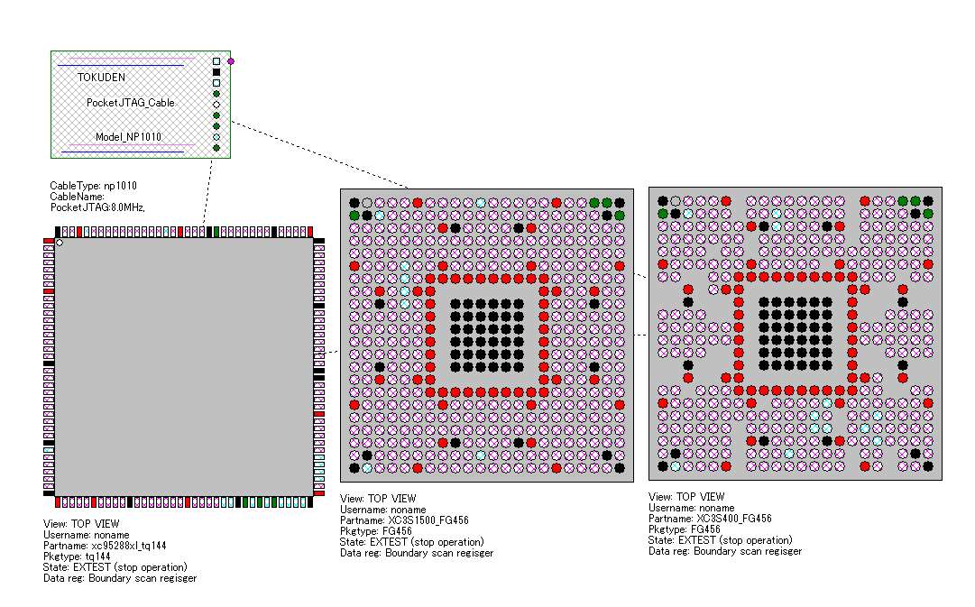 この検査を行うとき、FPGAは未コンフィグの状態にしなければなりません。なぜならば、FPGAはコンフィギュレーションされて動き出すと、I/Oの方向がJTAGで操作できない場合があるからです。未コンフィギュレーション状態のFPGAの端子はバウンダリスキャンで入力にも出力にも設定できますが、コンフィグされたFPGAでは、その端子がOUTOUT専用で作られた場合、JTAGでもINPUTにできない場合があります。(その逆もある)