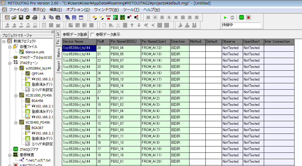 MITOUJTAGを起動し、ターゲットボードと接続します。そして、デバイスを自動認識してバウンダリスキャンで端子が見えることを確認しておきます。