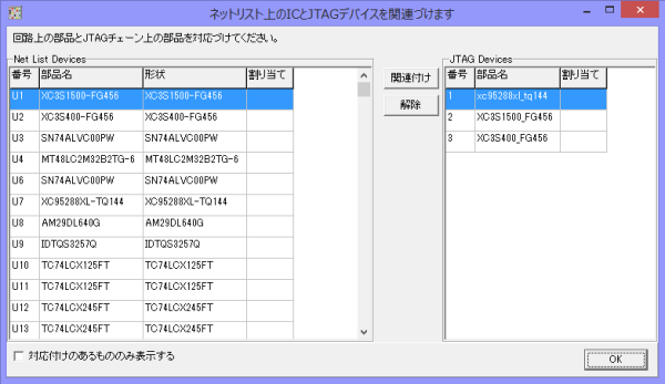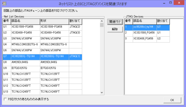 まず、図11の左側のテーブルでU7 (XC95288XL-TQ144)を選択し、右側でJTAGの2番を選択します。そして、「関連付け」ボタンを押します。これでU7がJTAGデバイスの1番目であると関連付けられます。