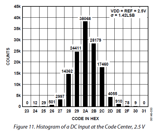 この性能は、使用しているADコンバータ(Analog Devices社 AD7691)のデータシートに記載されている、DC入力した場合のヒストグラムと比べても遜色がないことがわかります。