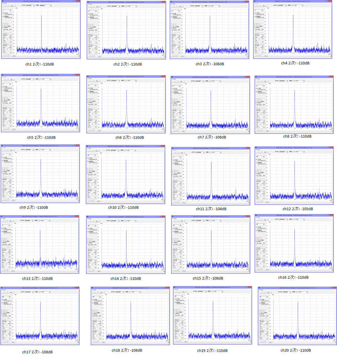 すべてのチャネルでひずみ率を測定(±約9.8V正弦波)したところ、観測されたひずみ成分は、どのチャネルでも同じように-110dB程度となっていました。