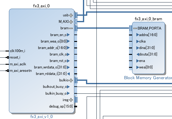 ここに標準的なブロックRAMを接続すると、USBWriteData(addr,data,len,1)で書き込み、USBReadData(addr,data,len,1)で読み出しができるようになります。