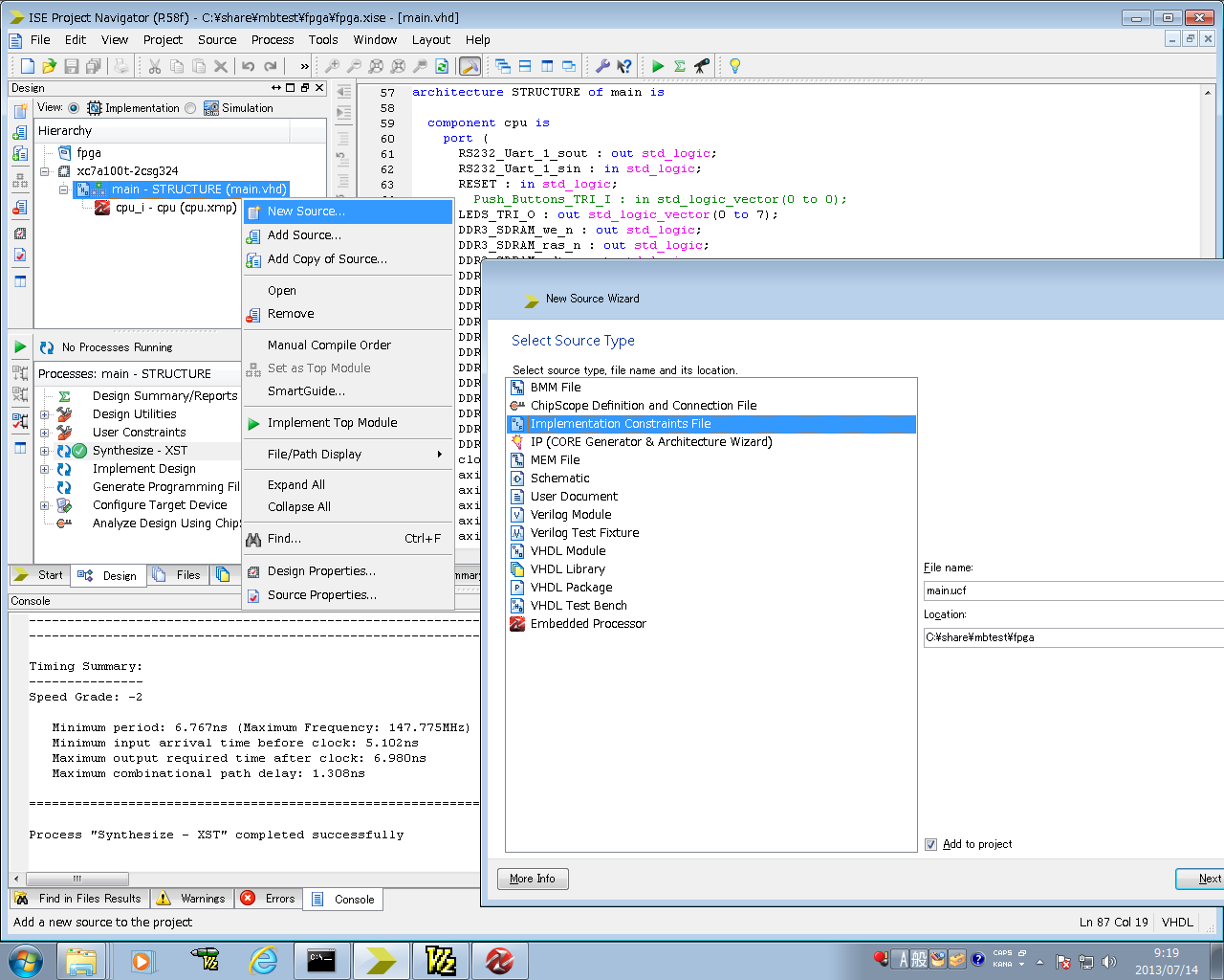 46. NewSource→Implementation Constrate Fileで、UCFファイルを作成します。ファイル名はmain.ucfとしておきます。
