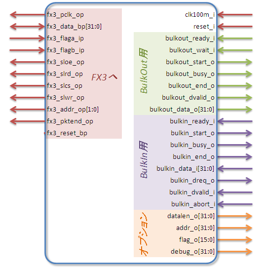 FX3用ポートは、FPGAの外にそのまま出して、EZ-USB FX3に直結してください。