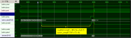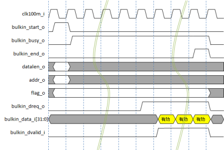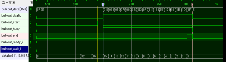 bulkin_start_oが1クロックアサートされて、PCからBulkIn要求が発生したことを知らせているのがわかります。ユーザ回路は、bulkin_dreq_oがアサートされているのを見たら、bulkin_dvalidと共にデータを送っています。
