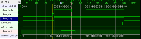 ホストPCからOUT転送が発行されると、bulkout_startが1クロックの間アサートされてOUT転送が発生したことを知らせます。その後、その一連のOUT転送が継続している間はbulkout_busy_oが'1'なります。OUT転送が終了するときに、bulkout_end_oが1クロックの間'1'になります。