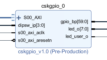BAR0に割り当てられています。PCかBAR0空間にアクセスすると、M_AXI_LITEのポートからシングルワードのトランザクションが発行され、csk_gpio内のレジスタにアクセスします。 |