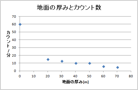 誤差を全く考慮していないのでいい加減なグラフで、はっきりとはしませんが、相関があるように思えます。地上では毎秒60カウントあったのに、地下では20カウント以下に減ってしまいます。