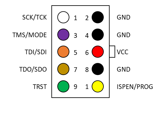 Latticeの8ピンのJTAGコネクタのピン配置を次の図に示します。HW-USB-1A、 HW-USB-2A、HW-DLN-3C、pDS4102-DL2、pDS4102- DL2Aで使用されています。このJTAGケーブルはJTAG以外にSDO/SDI/SCLK/MODEを使った信号も出すことができるためJTAGの類似のピンと共用されています。