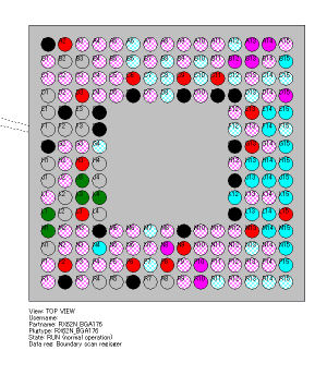 BGAの端子の状態が見えてしまいます。画面上の●や●や●は、BGAを上から透かしてみたときの1つ1つの端子の端子の状態をあらわしています。