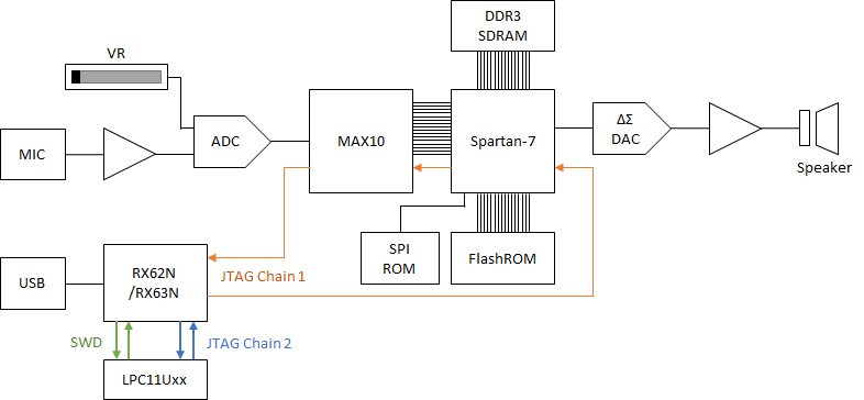 マイクで拾った音をディジタル変換してスピーカを鳴らすという単純な動作のボードなのですが、