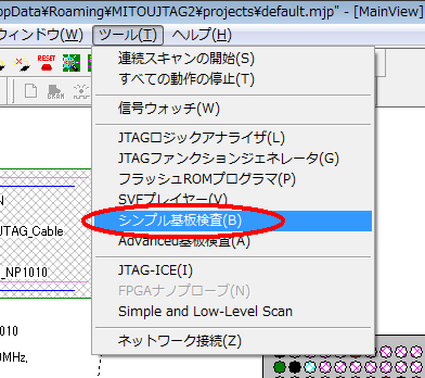 簡易接続検査ツールを起動するには、MITOUJTAGのメインメニューから「ツール→簡易接続検査」を選びます。バージョンによっては「シンプル基板検査」と表示されている場合もあります。