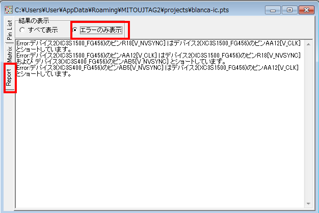 また、エラーレポート表示(Reportタブをクリックし、エラーのみ表示をチェックする)と、問題のある信号の状態のみピックアップされて表示されます。