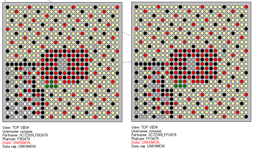 並べてみると明らかに違います。回転しても一致しません。この時点でピン配置に互換性がないことがわかるので、XILINXの分厚いマニュアルを見に行く必要はありません。