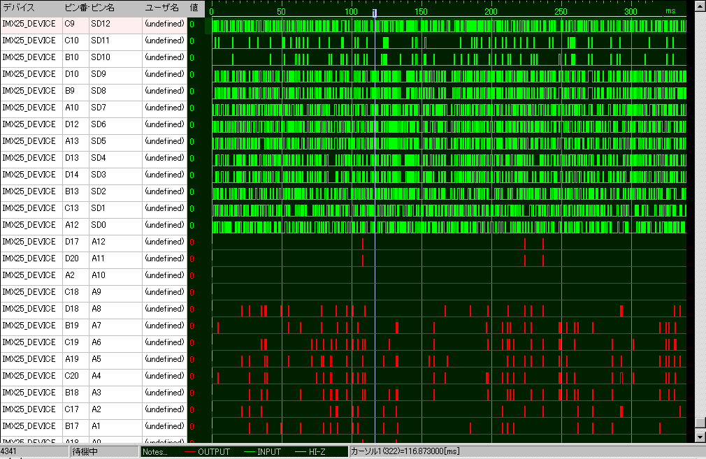 iMX25はMITOUJTAGに対応しているといえるでしょう。単純なオープン/ショートテストであれば、設定ファイルを作る必要はありません。デバイスのI/Oが、浮いているか、どこかにプルアップ/プルダウンされているか、またはどこかの出力ピンとショートしているかが自動的に調べられます。デバイス単体であっても、とてもとても手軽に検査ができてしまいます。