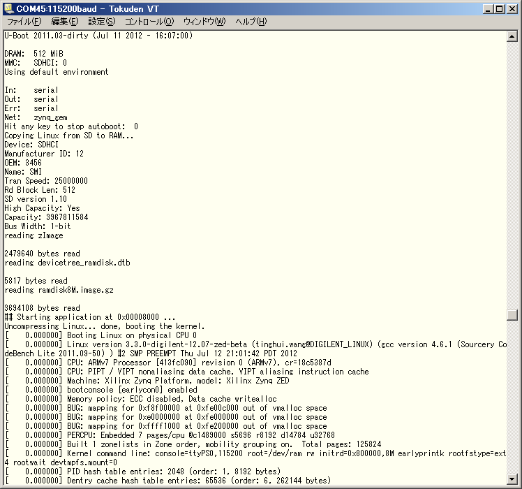 ZED Boardには、USBのポートが3つ!! (PROG UART OTGと書かれている)もあります。1つはUSB-JTAG、一つはUSB-OTG、もう一つはUARTです。普段はUARTにつなげばいいそうです。