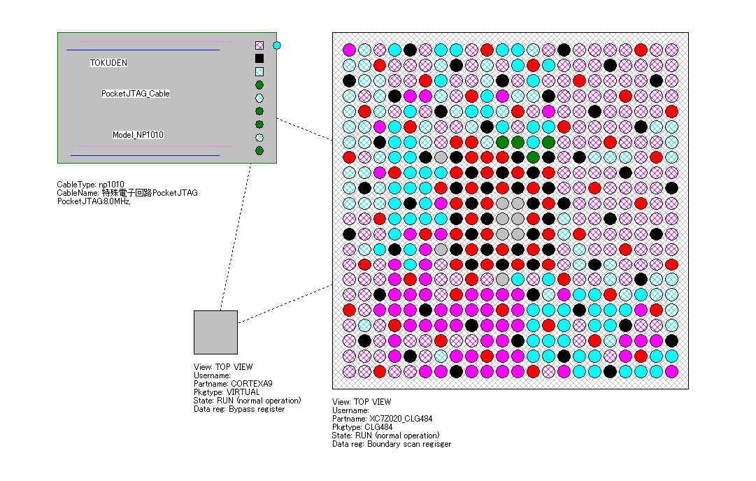まず、MITOUJTAGを起動してZED Boardを認識させます。すると、CORTEX A9と、ZYNQの本体認識されました。CORTEX A9のJTAG IDCODEは4BA00477、ZYNQのJTAG IDCODEは03727093でした。CORTEX A9はバウンダリスキャンできないので、小さな灰色の■で表示されます。
