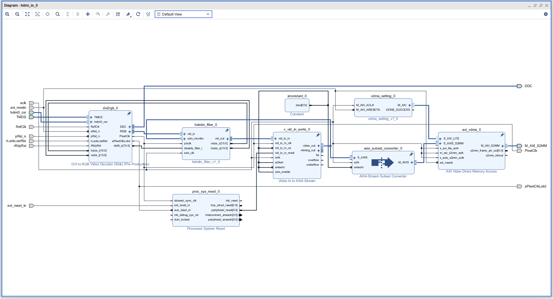HDMI入力ブロックは、DVI2RGB、hdmiin_filter、Video in to AXI4-Stream、AXIS Subset Converter、AXI VDMAのコアで構成されています。