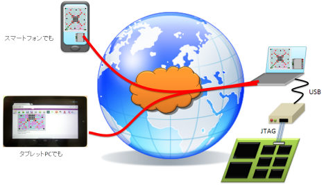 MITOUJTAG オンラインはクラウド技術を駆使したバウンダリスキャンソフトウェアです。従来のPCはもちろん、スマートフォンやタブレットPCなどからでもバウンダリスキャンを行うことができ、移動先から電子回路の状態を確認したり操作したりすることを可能にします。