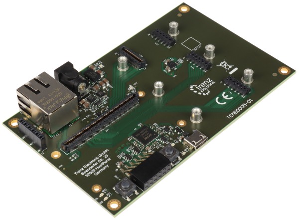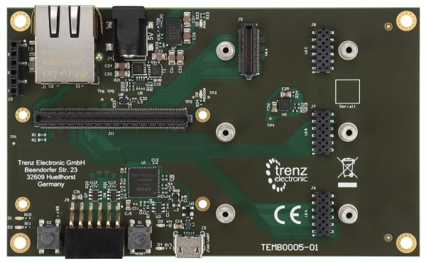 Trenz Electronic TEMB0005 は、Trenz Electronic のモジュール TEM00005 用のキャリアです。このキャリアには、LAN ソケット、FTDI JTAG/UART to USB2.0 ソリューション、低速 CRUVI B2B コネクタ 3 つと高速 CRUVI B2B コネクタ 1 つ、Pmod コネクタが装備されています。