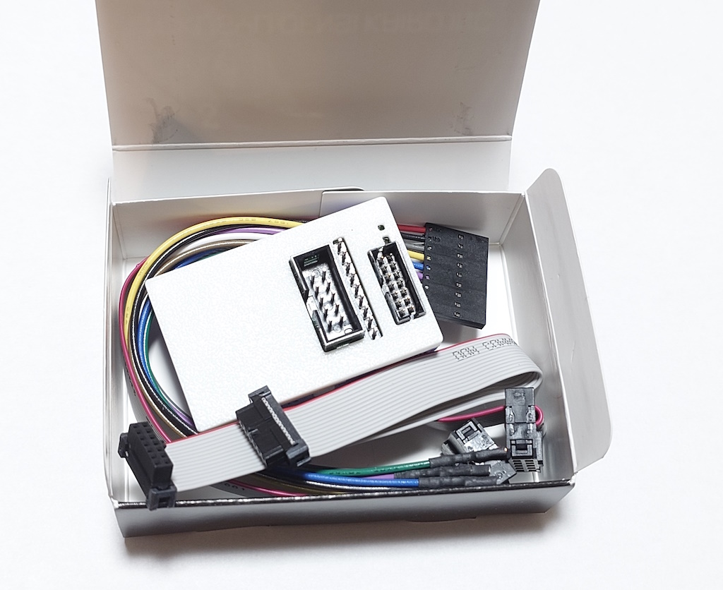 基板上にはXILINX 14pin、XILINX 9pin、ALTERA 10pinのヘッダを実装しています。9ピンフライリードケーブル、10ピンフラットケーブル、14ピンリボンケーブルを同梱していますので、箱をあけたらすぐにターゲットボードにすぐに接続することができます。