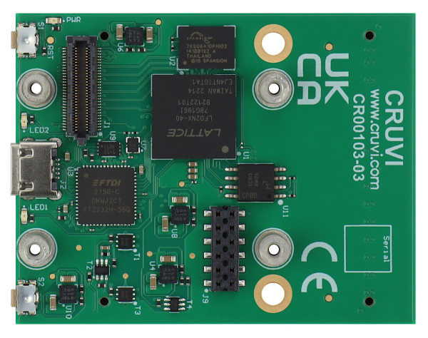 この製品の前身は CR00103-02-Aです。すべての変更は製品変更通知 (PCN)に記載されています。このボードは、Lattice の Nexus FPGA Certus-NX に基づいており、新しい CRUVI 規格 (www.cruvi.com) に従って設計されています。