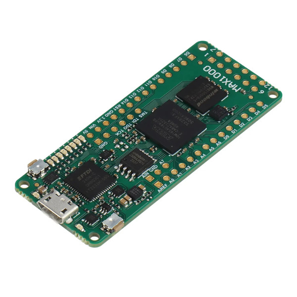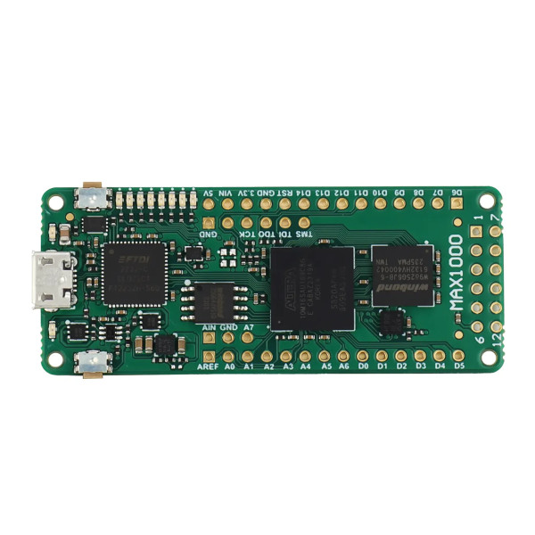 この製品の前身は TEI0001-04-FBC84Aです。すべての変更は製品変更通知 (PCN)に記載されています。新しい FPGA IoT Maker ボードは、エンドツーエンドのアプリケーション開発向けに設計され、コストが最適化されています。Arrow MAX®1000 ボードは、カスタム アプリケーションに直接インストールすることも、完全に別のボードに統合することもできます。これは、開発用に柔軟で低コストの FPGA プラットフォームを必要とする新興企業、大学、または既存の機器メーカー向けに作成されました。カスタマイズされたバリエーションも提供できます。メーカーボードの中心には、コンパクト (11x11mm) の Altera®MAX®8000 個のロジック エレメントを備えた 10 FPGA。この単一チップには、統合フラッシュ メモリ、アナログ信号用の 1Msps 12 ビット ADC、および 3.3V 電源が含まれています。その他の機能には、組み込み SRAM、DSP ブロック、ミリ秒以内のインスタントオン、Altera®NIOS II ソフトを実装する機能などがあります。 MAX1000の電源は、USBポートまたは別のピンから5Vとして供給できます。統合コイルを備えた Enpirion DC/DC コンバータが、ボード上で使用される 3.3V 電源を生成します。MEMS 発振器は、FPGA と USB ブリッジにクロック供給を提供します。低消費電力の 3 軸加速度センサーこれも MEMS テクノロジーに基づいています。 IoT アプリケーションでしばしば必要となる位置および動きの検出に使用できます。外部SDRAMは、アプリケーションデータのストレージまたはNIOS IIプロセッサのメモリとして使用できます。FPGAの使用を簡単に紹介するために、NIOS IIソフトIPコントローラを使用した一連のデモプロジェクトがMAX1000に提供されています。8 個の構成可能な LED をステータス表示に使用でき、ユーザー入力は 2 つのボタンで行うことができます。Arduino MKR 標準に基づく 2 列コネクタと Pmod プラグにより、ワイヤレス IC やセンサー用のアダプター ボードを接続する機能など、柔軟な接続オプションが提供されます。