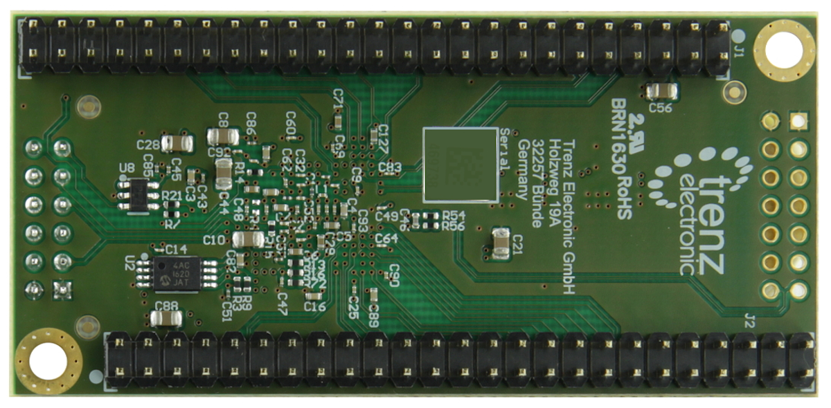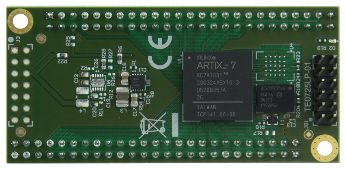 - 1 x TE0725LP-02-72C-AT Trenz Electronic FPGA module with AMD Artix™ 7 100T and soldered pin headers (J1, J2 pin headers soldered on bottom, J3 missing, JB1 soldered on top)