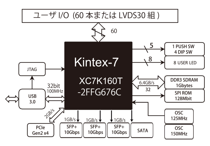 光ファイバは最大40Gbps(4GBytes/sec)、DDR3メモリは6.4GBytes/s、PCI Expressは2GBytes/sの帯域を持っています。光ファイバから受信したデータをFPGAでフィルタリングあるいは加工し、その結果をメモリに格納したりPCに取り込んだりするような用途に最適です。
