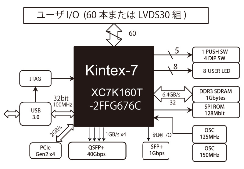 光ファイバは最大40Gbps(4GBytes/sec)、DDR3メモリは6.4GBytes/s、PCI Expressは2GBytes/sの帯域を持っています。光ファイバから受信したデータをFPGAでフィルタリングあるいは加工し、その結果をメモリに格納したりPCに取り込んだりするような用途に最適です。