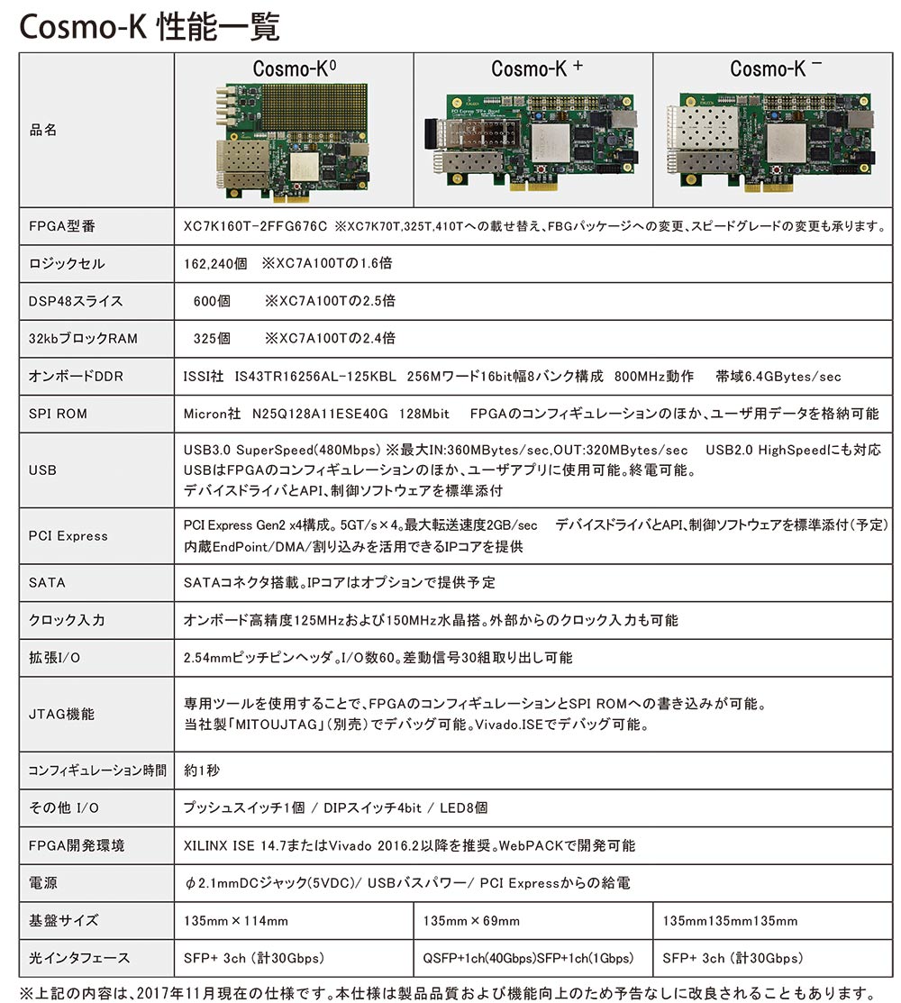 また、当ボードはメザニンではなく2.54mmピッチのピンヘッダを使って拡張するので、余分なコストをかけずにユーザ回路を追加するのにユーザ回路を追加することができます。Cosmo-KにはK0、K+、K-の3種類のラインナップがあります。