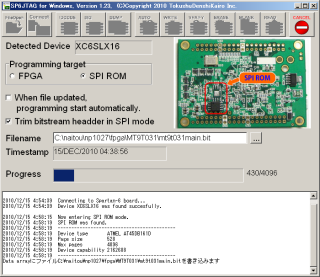 付属のSP6JTAG for Win ユーティリティで、コンフィギュレーションデータをSPI ROMに書き込みます。