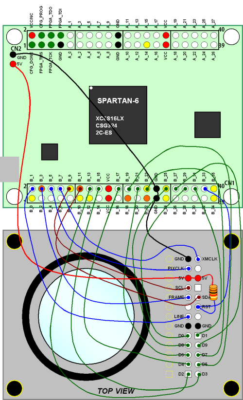 MT9T031C12STCHモジュールに接続する信号には、D9〜D0、MCLK、PIXCLK、SDA、SCL、HREF、VSYNCがあります。これらの信号を下の表に示すように、Spartan-6評価ボードのピンヘッダにつなぎます。