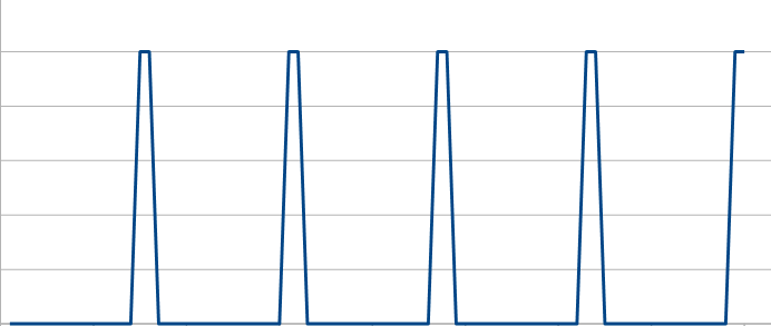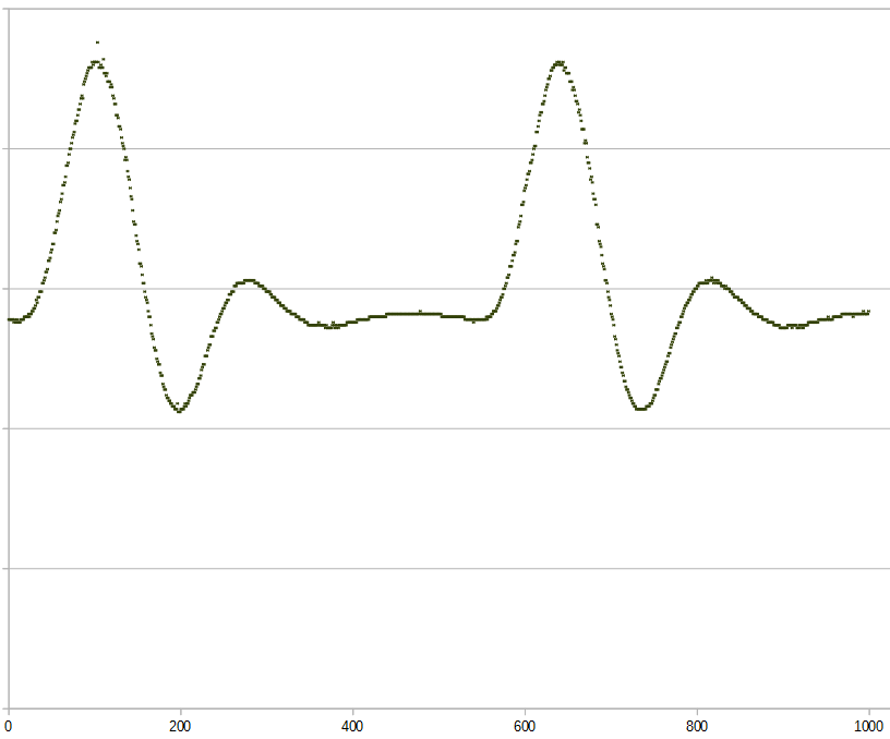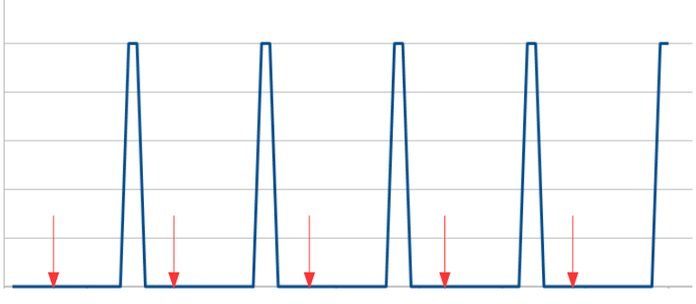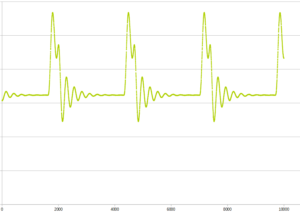 計測対象の信号は以下のような波形です。今回はCOSMO-Z自身で生成しており、ADCの計測クロックと完全に同期しています。これを外部出力のピンに出力し 1KΩ の抵抗を介しADCの計測チャンネルに接続しています。