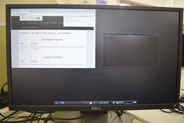 電源を供給し、SW3を押すとLEDが点灯し、ディスプレイに映像が映し出されました。Ultra96はUART0がBluetoothと接続されており、J15(UART1)には起動メッセージは表示されませんでした。