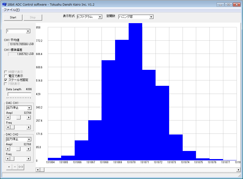 18bit AD変換の結果は常にノイズで揺らいでいるため、固定値にはなりませんが、ヒストグラムを取ってみると、ほぼ±2LSBの範囲内に収まっており、ノイズレベルは約140μVであることがわかります。