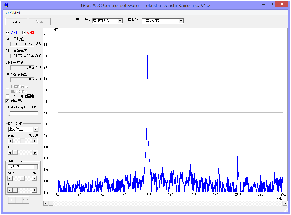 オーディオアナライザ(Panasonic製VP-7723A)を用いて、正弦波(-100dBc)を入力し、50kHzでサンプリングしたときのスペクトラムを示します。