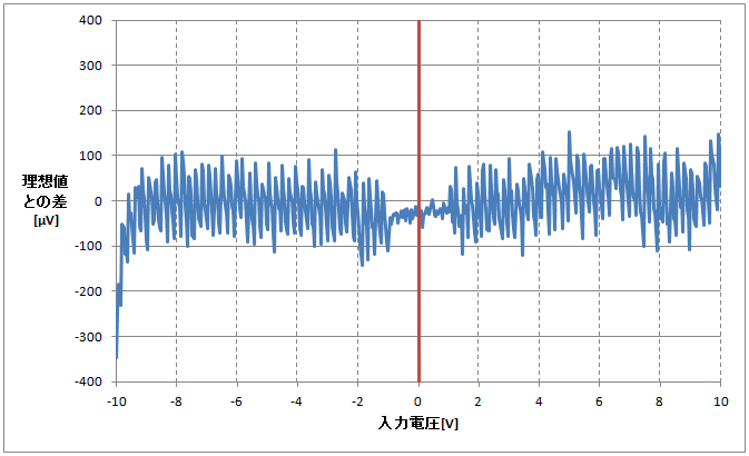 標準電圧発生器(YOKOGAWA 7651)を用いて-10Vから+10Vまでの電圧を0.04Vステップで与えたときの計測値と、与えた電圧の差をグラフ化することで、簡易的にINLを測定したところ、±100μVの範囲内に収まっていることが確認できました。