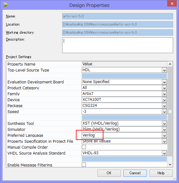 CoreGeneratorを使ったAXI版のDDR3コアはVerilogで生成されます。したがって、ISEプロジェクトをVerilogにしておく必要があります。