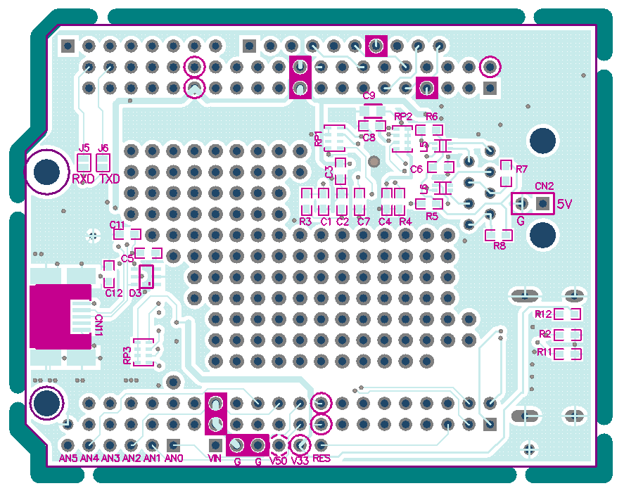 拡張ボードを設計して出図した。Arduinoの形状で、100BASE-TX LANを備えていて、DVI/HDMI出力ができて、マイクロSD/MMCカードとUSB仮想シリアルポートもあるというものです。下の図は設計中のもの。