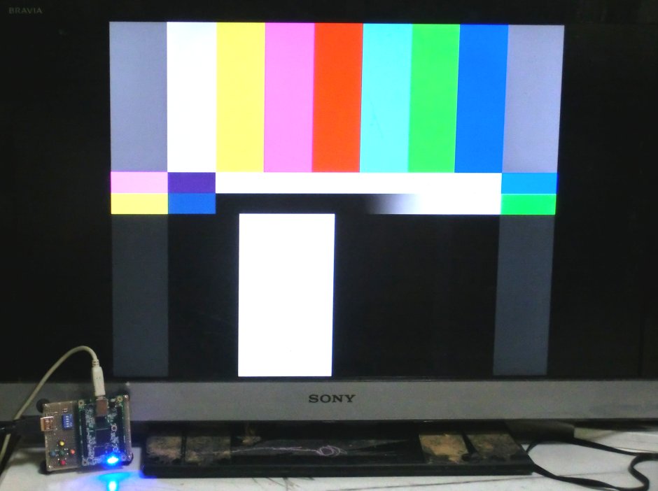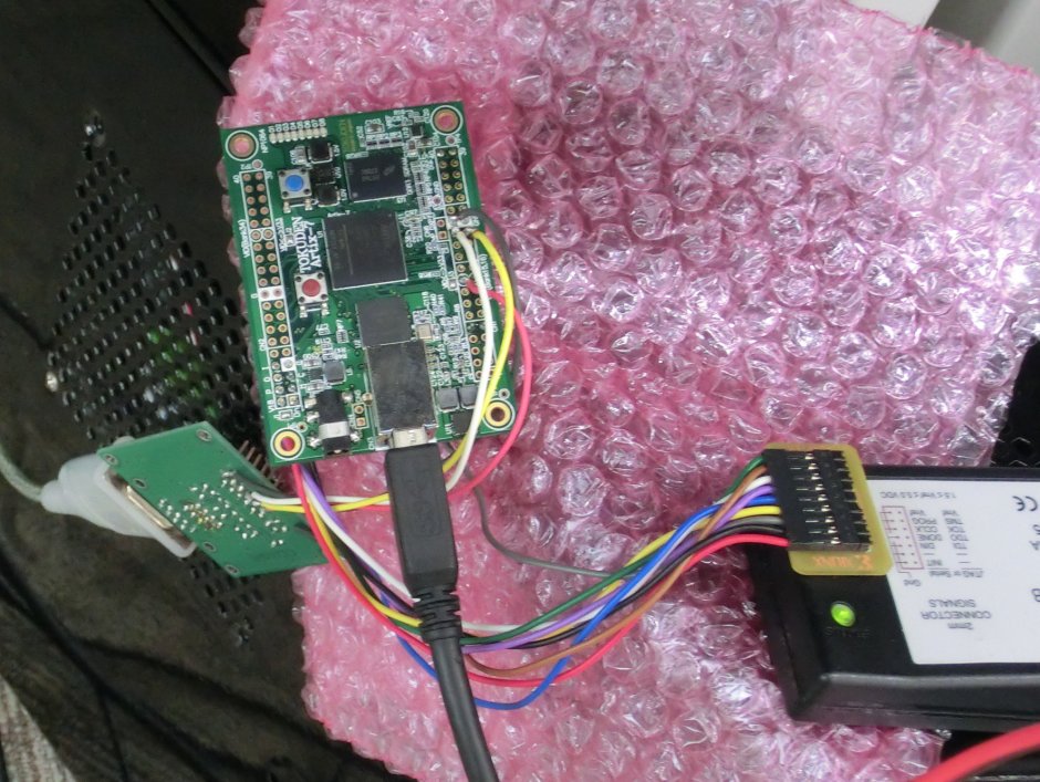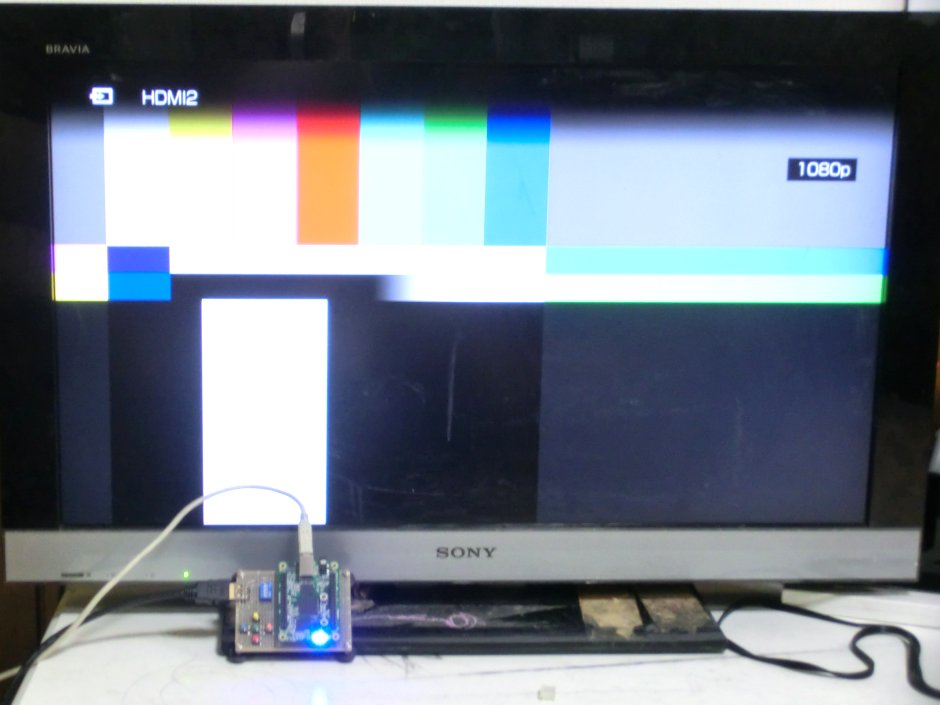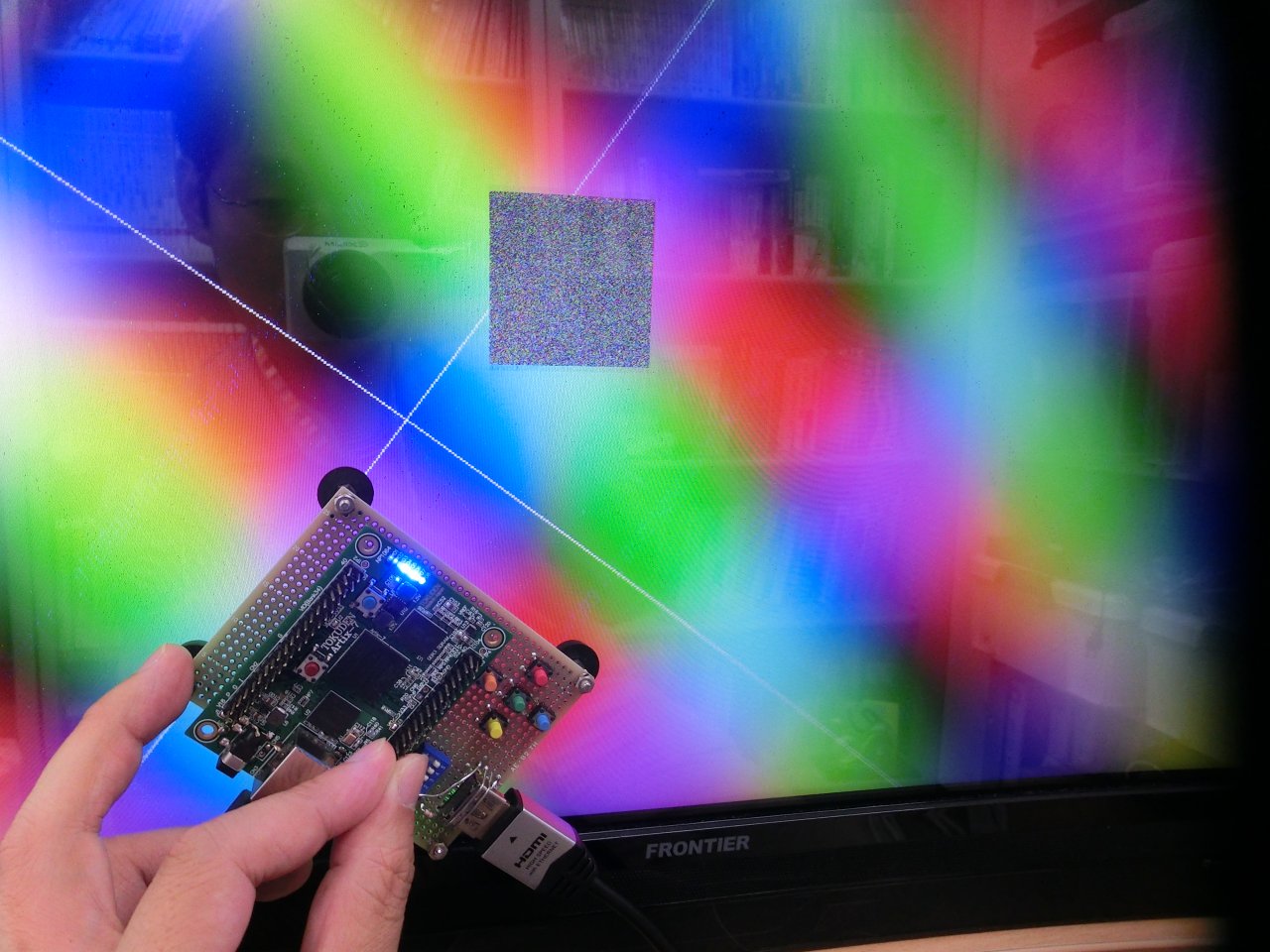 さっそく実装して、HDMI出力と、USB-UARTの動作を確認。HDMIのSCLとSDAを間違えてプルアップしてしまったので、家庭用HDTVで絵が表示されないトラブルがあって、そうとうハマった。