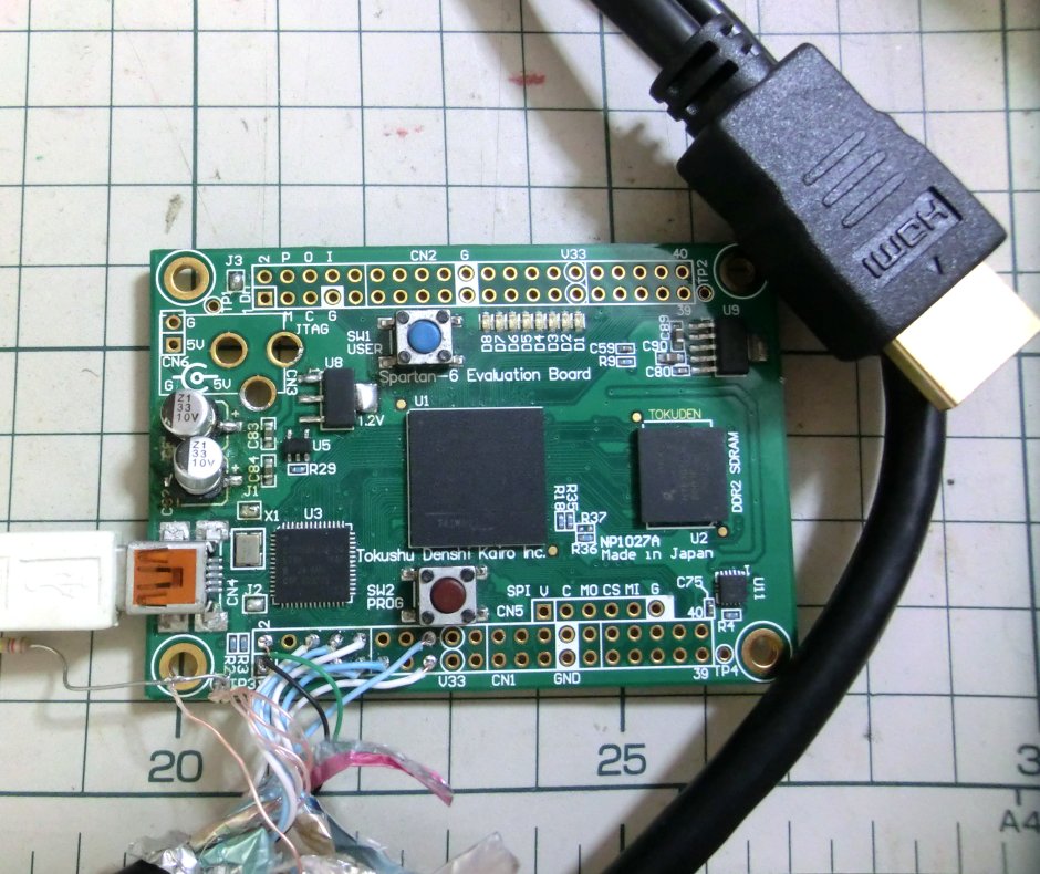 前身のSpartan-6ボードを使って、HDMI出力の実験中。Spartan-6の汎用I/OからHDMI信号が出せてSXGA(1280×1024)の信号が出力できたので、明日はこれをArtix-7に移植します。