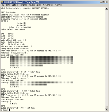 U-Bootでネットワーク接続し、TFTPブートでLinuxのイメージを取ってくることまでできました。