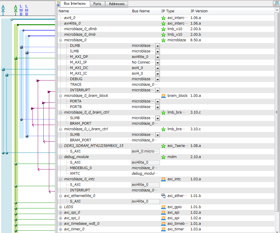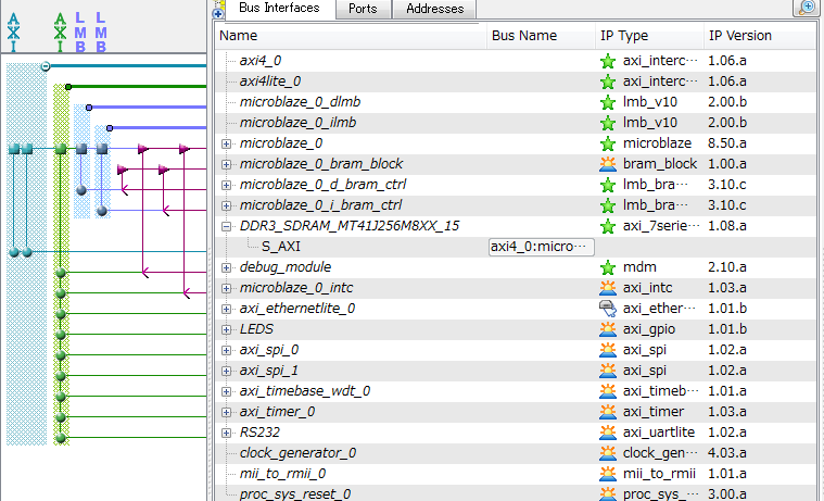 AXIバスにはaxi4_0とaxi4lite_0の2種類があります。axi4_0はフル規格のAXIバスで、DDR3メモリに接続されています。axi4liteはLite版で、デバッグモジュールや割り込みコントローラ、LEDなどのGPIO、SPI、RS232Cなどペリフェラルが接続されています。