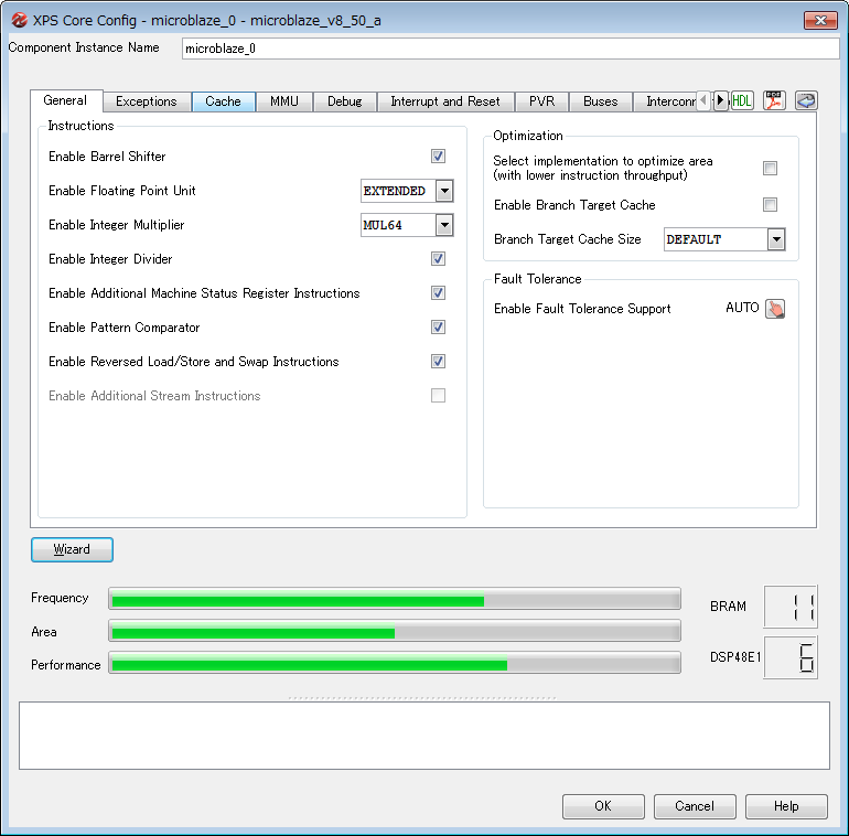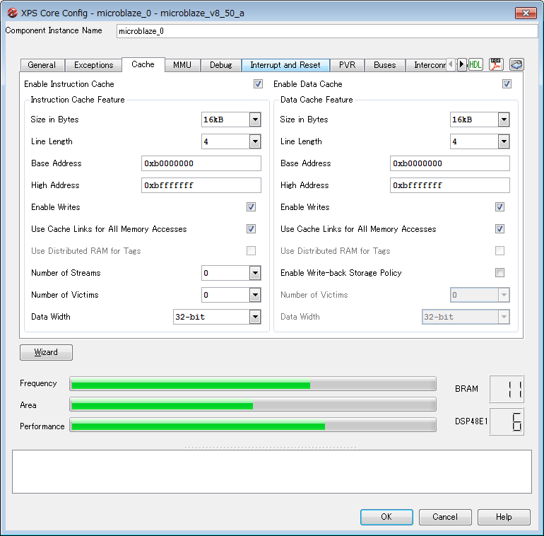 MicroBlazeのローカルメモリバス(LMB)に、d_bramとi_bramという2つのBlockRAMがつながっています。これはキャッシュメモリとして動作します。