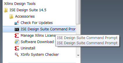 data2memを使うには、スタートメニューのXILINX Design Suite 14.5の中のAccesoriesの中にあるISE Design Suite Command Promptを起動します。