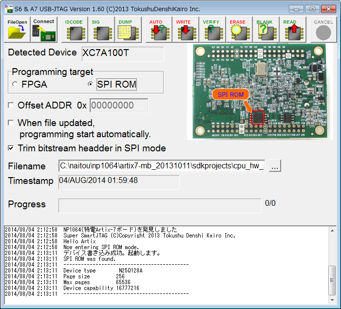 できあがったBitStreamをSPI ROMに書き込むには、特電のs6a7jtagwツールを使うと便利です。